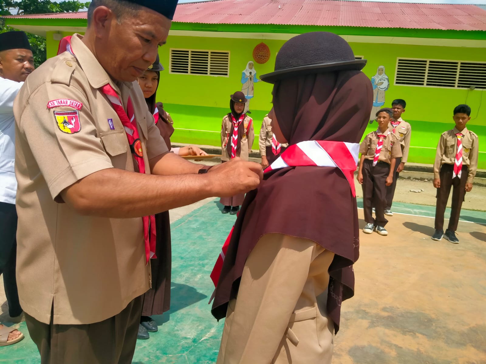 “Melalui kegiatan Perjusami, diharapkan nilai-nilai kepramukaan dapat tertanam kuat pada diri siswa, sehingga mampu diaplikasikan dalam kehidupan sehari-hari, baik di lingkungan madrasah maupun masyarakat,” ujar Bapak Mulyandri, S.Pd.dilanjutkan Pemasangan Tanda peserta Perjusami.